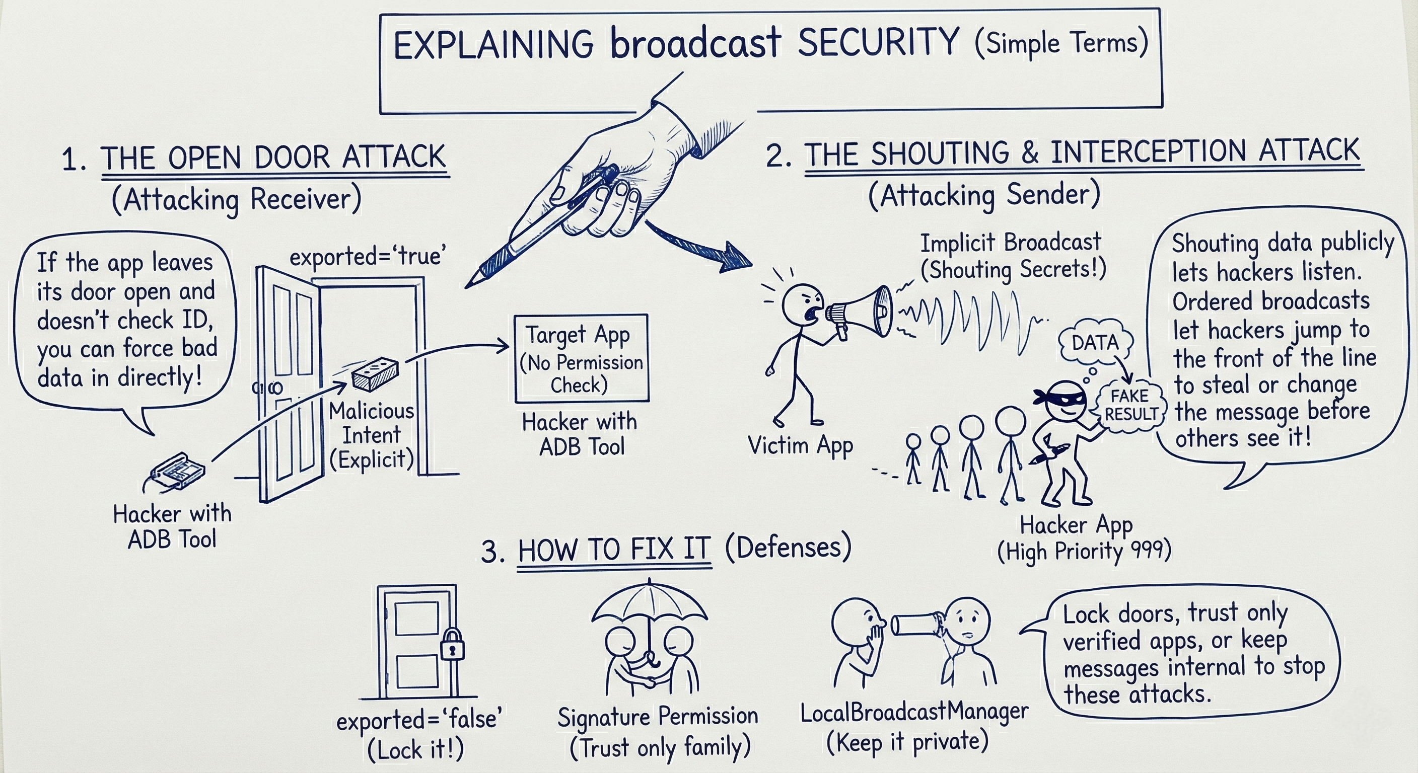 This image provides a high-level visual summary of Broadcast Receiver attack paths and defenses.