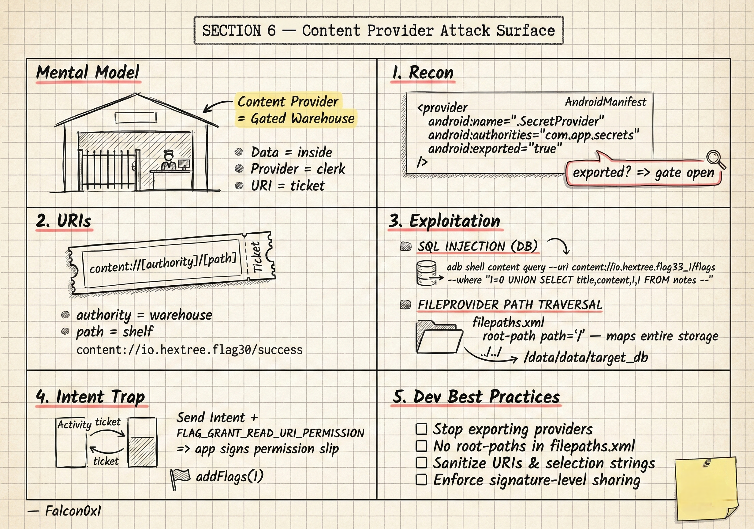 The first step isn’t attacking; it’s mapping. You look at the AndroidManifest.xml. If a provider is Exported, the gate is open to the public.
